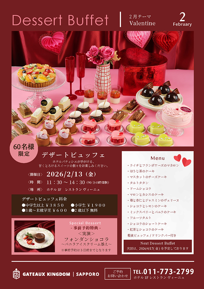 〈2026/2/13 開催〉デザートビュッフェ「バレンタイン」※定員に達しましたので、ご予約受付は終了いたしました。