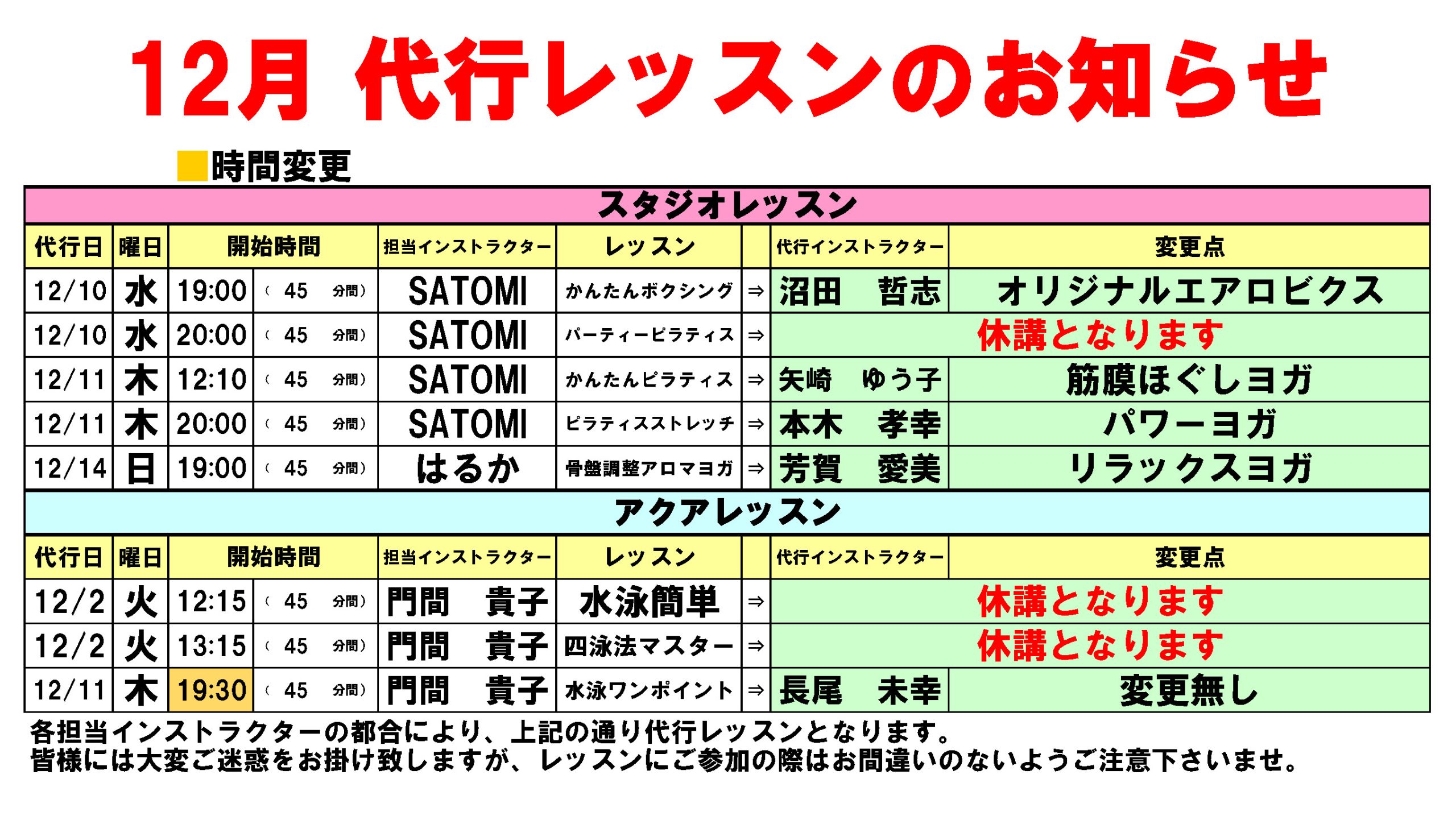 フィットネス スタジオ 12月の代行レッスンのお知らせ