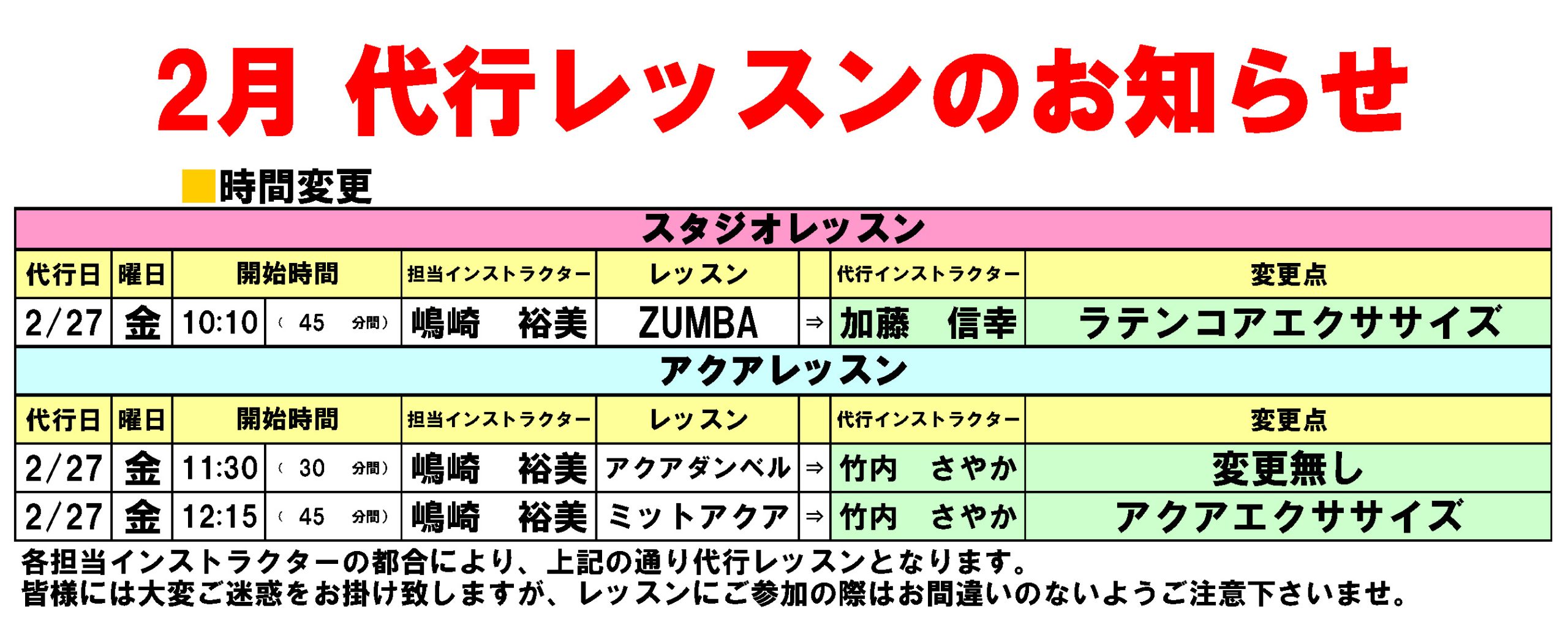 フィットネス スタジオ 2月の代行レッスンのお知らせ