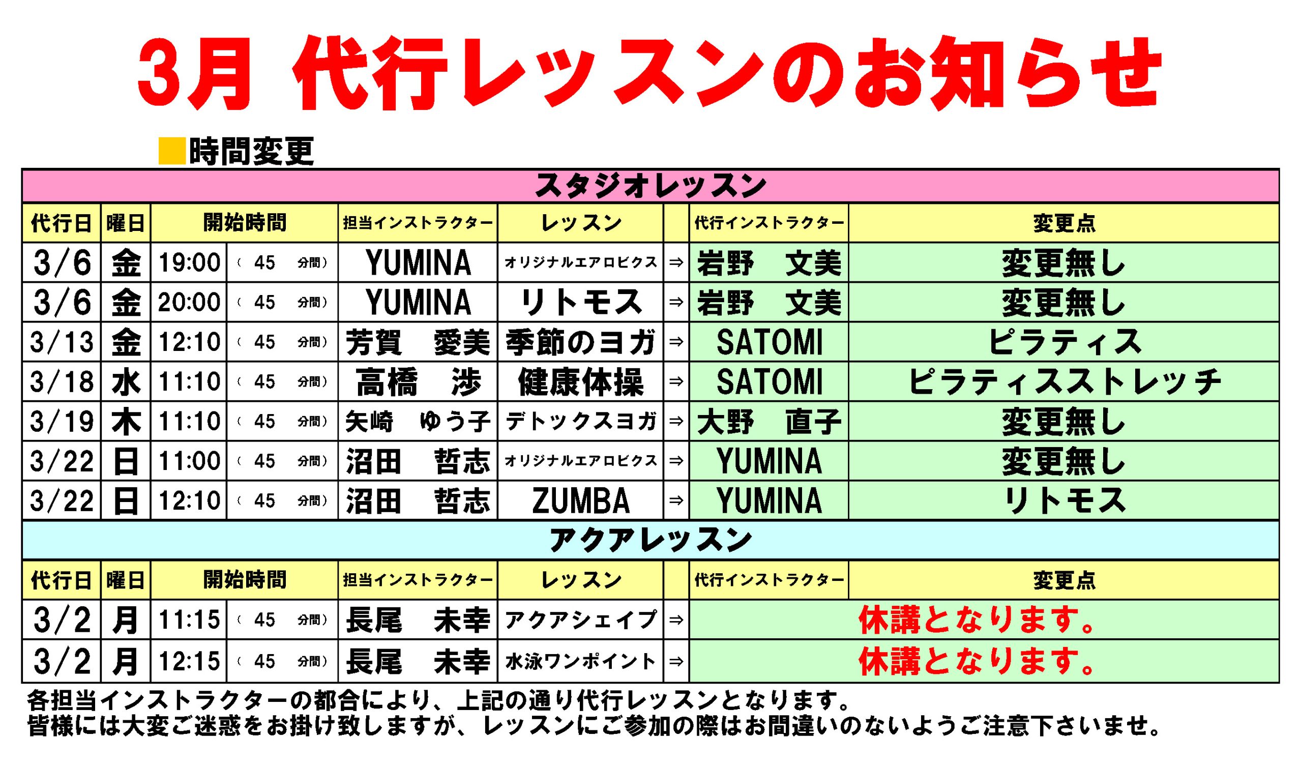 フィットネス スタジオ 3月の代行レッスンのお知らせ
