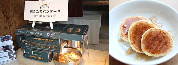 センサーに手をかざすと、数十秒で焼き上がる自動パンケーキマシンが朝食ビュッフェに登場。