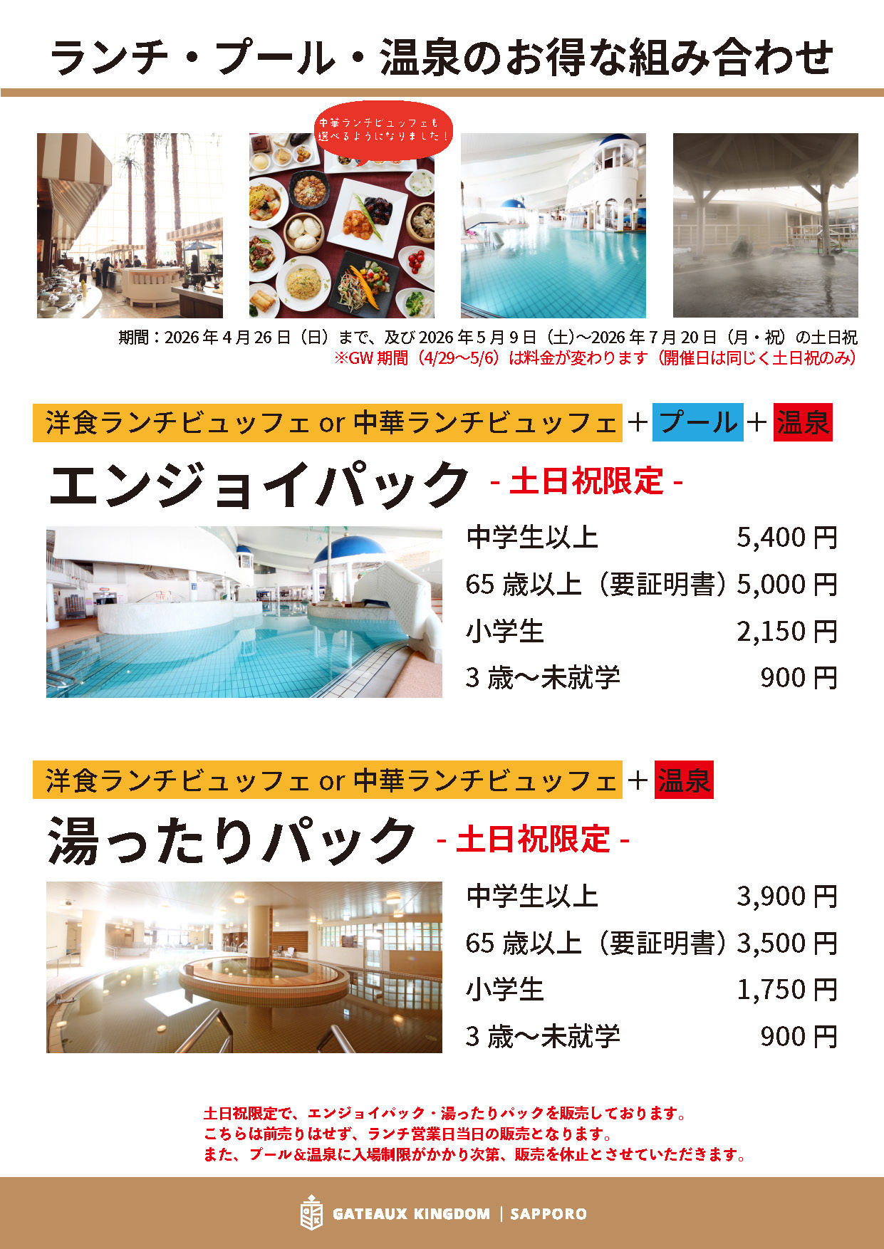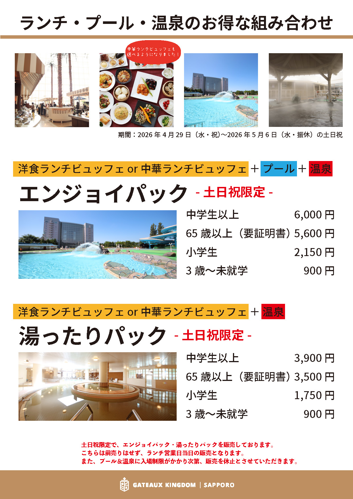 -土日祝限定-「エンジョイパック」(プール&温泉+洋食or中華ランチビュッフェ)・「湯ったりパック」(温泉+洋食or中華ランチビュッフェ)
